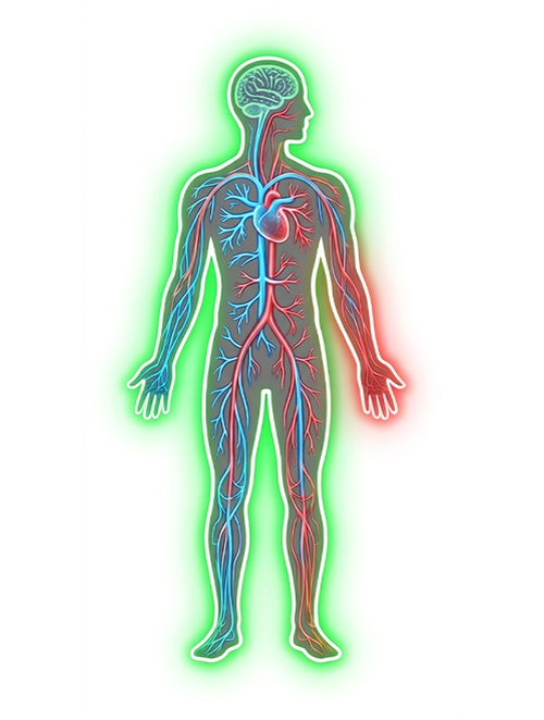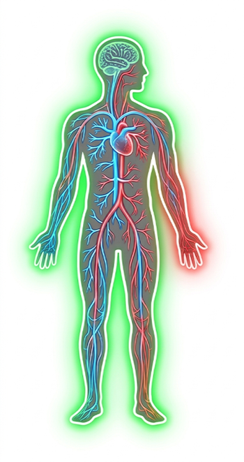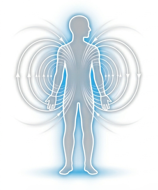 FAZA 1: Układ magnesów w centrum stopy generuje pole skalarne, które udrażnia zablokowane kanały limfatyczne i resetuje potencjał elektryczny w komórkach nerwowych. Następuje aktywacja procesu głębokiej regeneracji, a dzięki automatycznej biostymulacji organizm walczy z bólem u źródła.